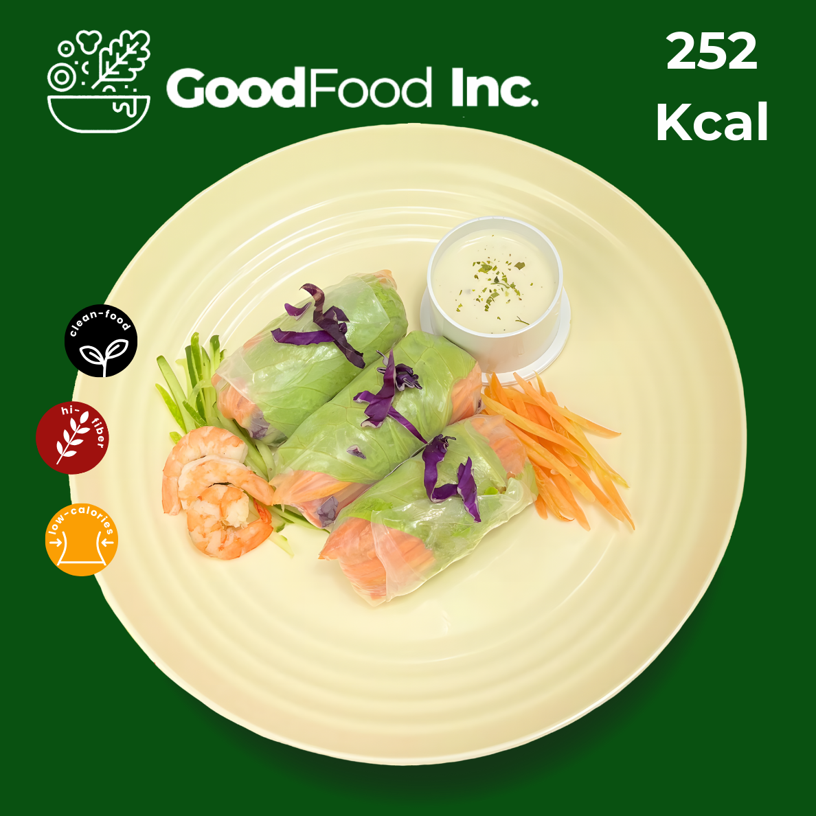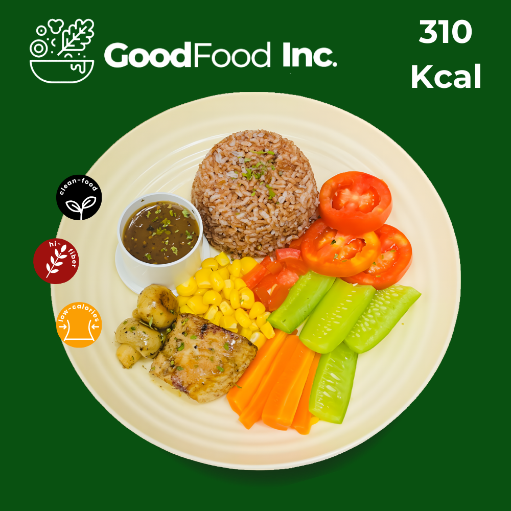 Bihun jagung disajikan dengan toping ayam berbumbu, telur dan sayuran segar dilengkapi dengan dressing